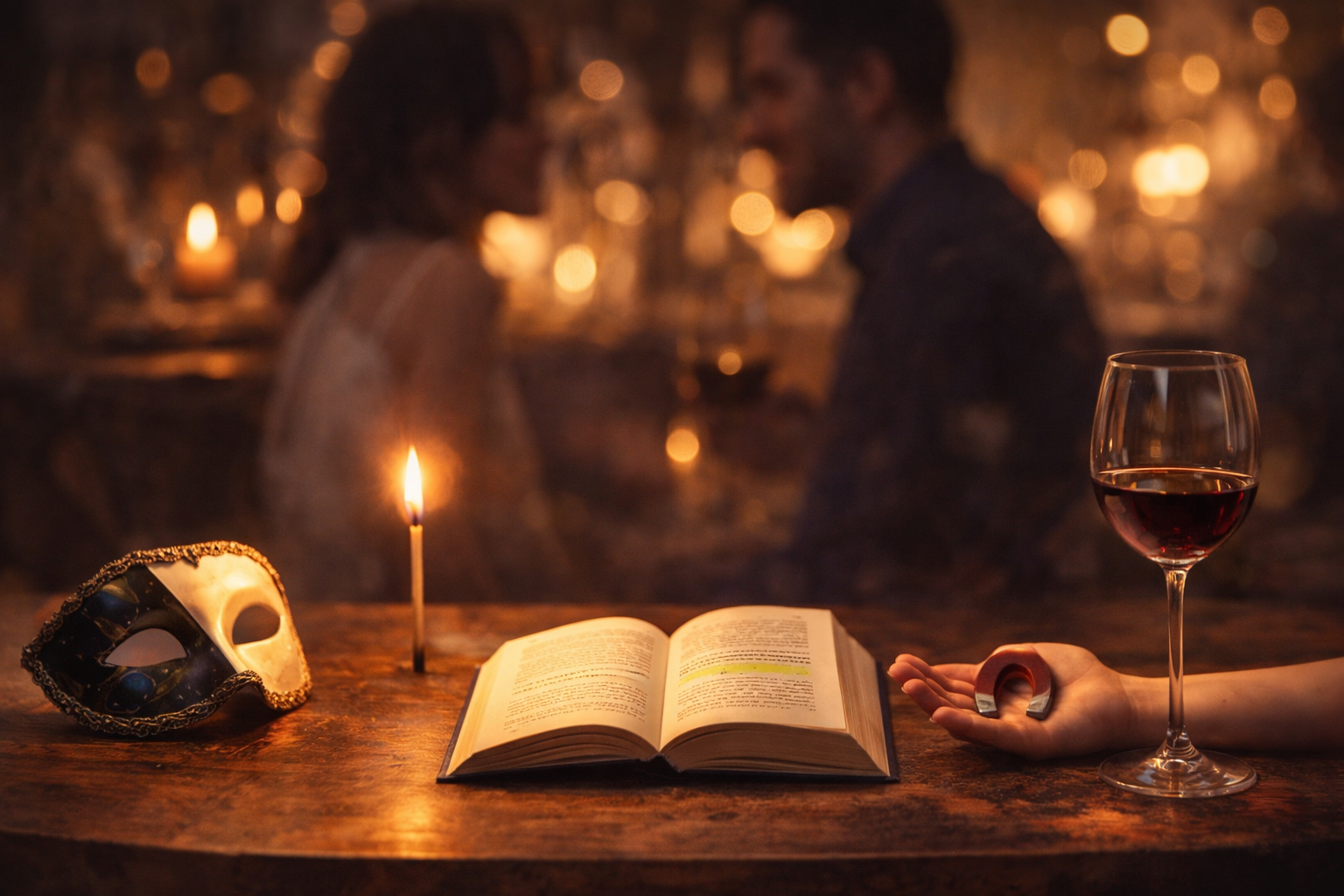 Imaginează-ți o primă întâlnire care încă nu e o întâlnire. O privire, un spațiu comun, nimic spus direct. În fața ta apar cinci gesturi-obiect. Nu te gândi ce "sună bine" alege ce ai face instinctiv.